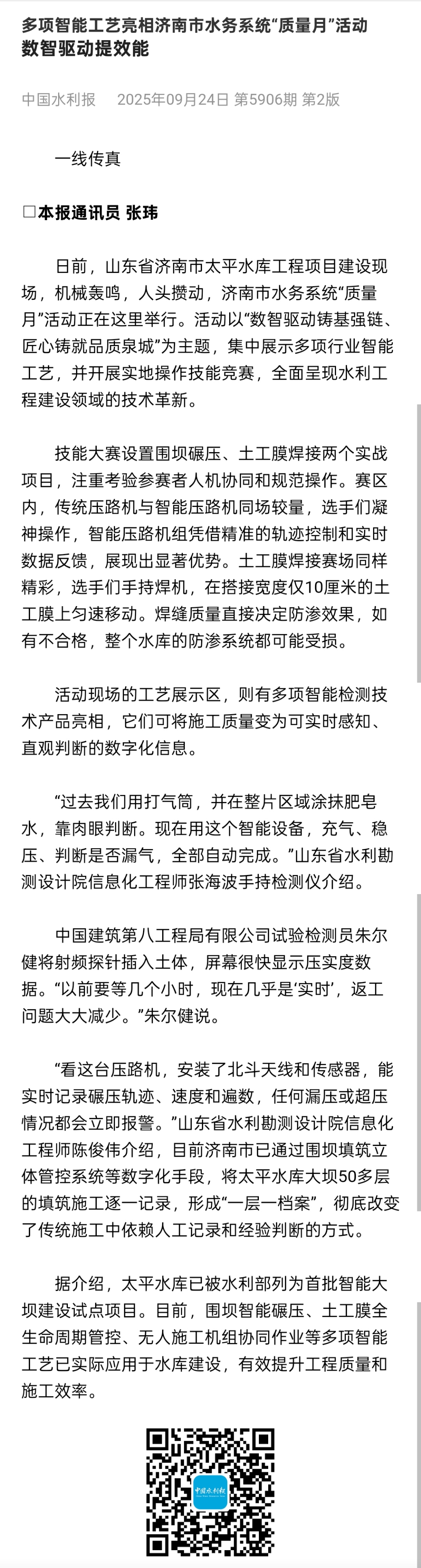 ? ? ? ?近日,中國水利報以《數智驅動提效能》為題,報道了濟南市水務系統“質量月”活動,多項智能工藝在濟南市太平水庫工程項目建設現場亮相,并通過實地操作技能競賽,展現了在技術革新下水利工程建設領域的高效發展。